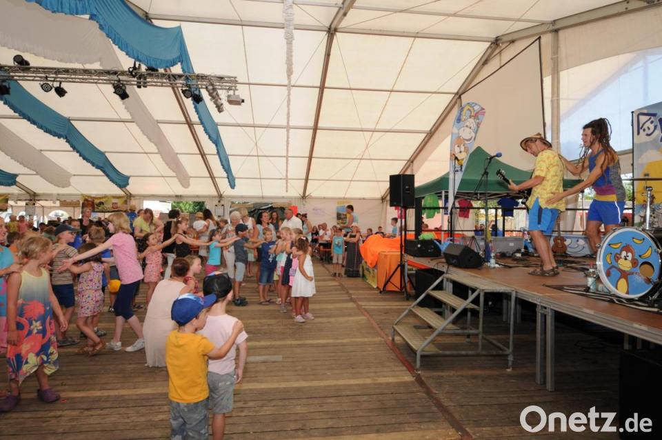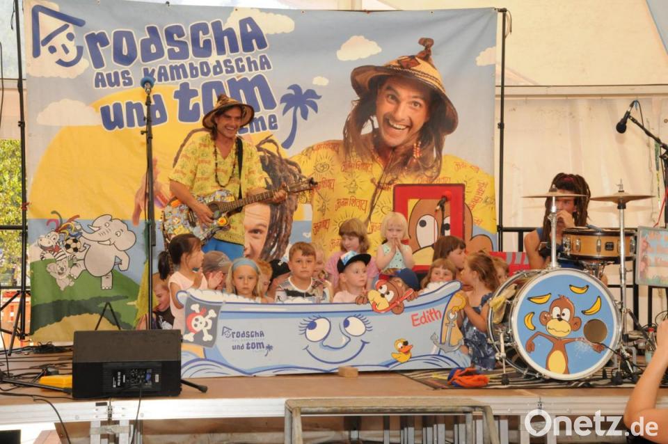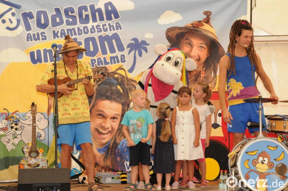 Für die Kinder, auch für die Eltern, war natürlich der über zweistündige Auftritt von „Rodscha aus Kambodscha“ der wirkliche Höhepunkt. „Kindermusik, die auch Erwachsene begeistert“, überschreiben Roland Schneider und Thomas Wagner ihr Programm. Wie zutreffend das ist, zeigte sich in wunderbarer Weise: Die Kinder standen im Halbkreis vor der Bühne, mit dabei viele Mütter, die ebenfalls bei den Liedern mitsangen. Immer wieder holten die beiden Künstler Kinder auf die Bühne, um sie in ihr Programm einzubinden. Da durften die Kinder in einem imaginären Boot sitzen, ein „Zebra“ streicheln, ein Mädchen wurde als „Geist“ verkleidet und Biene Maja war auch dabei.