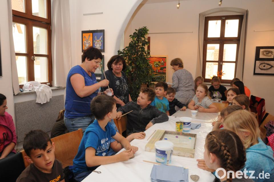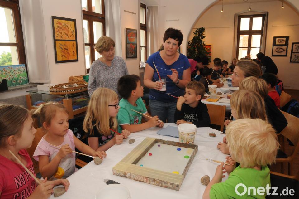 Christa Walbrunn führte die Kinder mit Erläuterungen zu unterschiedlichen Kieselsteinen in den "spielerischen und malerischen" Nachmittag ein. Da war dann doch die Pädagogin nicht zu überhören, denn im lockeren Fragen- und Antwortspiel erreichte sie es, den Kindern die Antworten zu entlocken, woher in Pleystein die Kiesel mit ihrer unterschiedlichen Oberfläche, rau oder glatt kommen. Kirchenmalerin Monika Müllner hatte genügend Arbeitsmaterial mitgebracht, um für Vollbeschäftigung bei den Buben und Mädels zu sorgen. Da war zunächst das Aussehen eines Steines mit einer möglichen Realität in Verbindung zu bringen, darauf baute sich dann dessen farbliche Gestaltung auf. Dafür war es notwendig, den Kieselstein erst mit einer transparenten Farbe im Sinne der späteren Bemalung oder der Beklebung mit Gold- oder Silberstreifen zu bestreichen. Dann standen Farbpaletten bereit, die feinen Pinsel dazu, um die Steine zu bemalen. Mit hauchdünnem Gold- und Silberpapier durften die Steine umhüllt werden. Nach getaner Arbeit hatte der Museumsarbeitskreis für die Buben und Mädchen eine Stärkung parat.