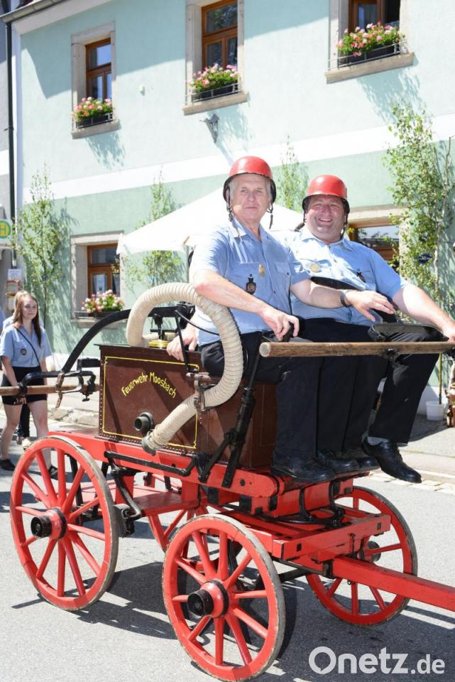 Die Nachbarwehr aus Moosbach bringt zum Festzug eine handbetriebene Pumpe mit.