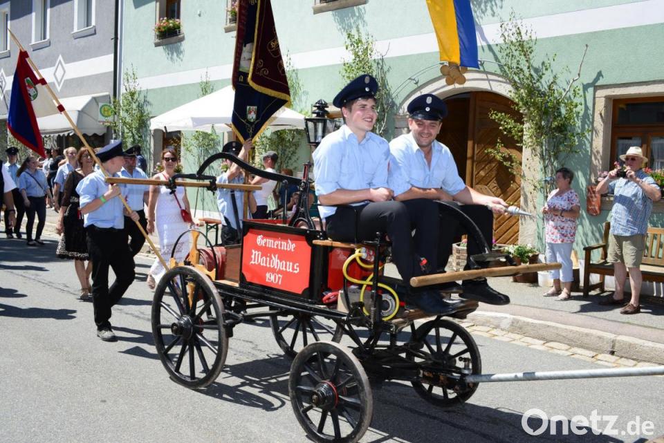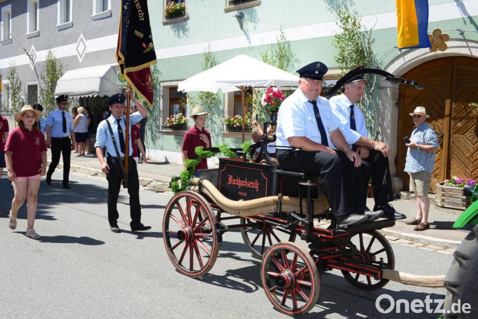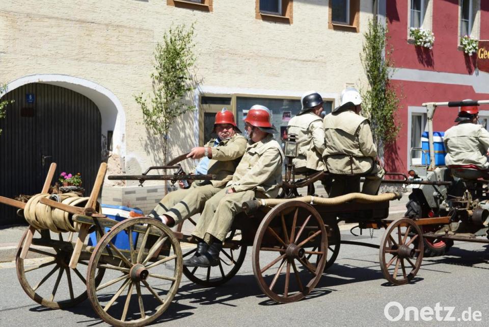 Als Festwagen brachten die Wehren ihre museumsreifen Spritzen, natürlich noch per Handbetrieb, mit. Echter Kontrast zu den Hitzegraden die Abordnung des TSV-Schiclub Pleystein mit ihren schon historischen Skiern. Die Stadtkapelle Pleystein, die Trachtenkapelle Waldthurn, das Vereinsorchester Waidhaus, die Blaskapelle Weiding und die Blaskapelle Dietersdorf gaben den Festzugteilnehmern den Marschschritt musikalisch vor.
