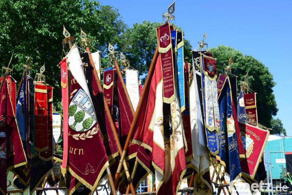 Der Fahnenwald lässt erkennen, wie viele Wehren und Vereine sich beim Festzug beteiligten.
