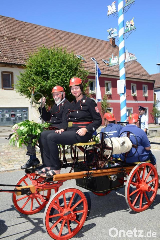 Die Patenwehr aus Waidhaus hat ihren Handspritzenwagen aus dem Jahr 1907 mitgebracht. Mit dabei auch Bürgermeisterin und stellvertretende Landrätin Margit Kirzinger (hinter dem Fahnenträger).