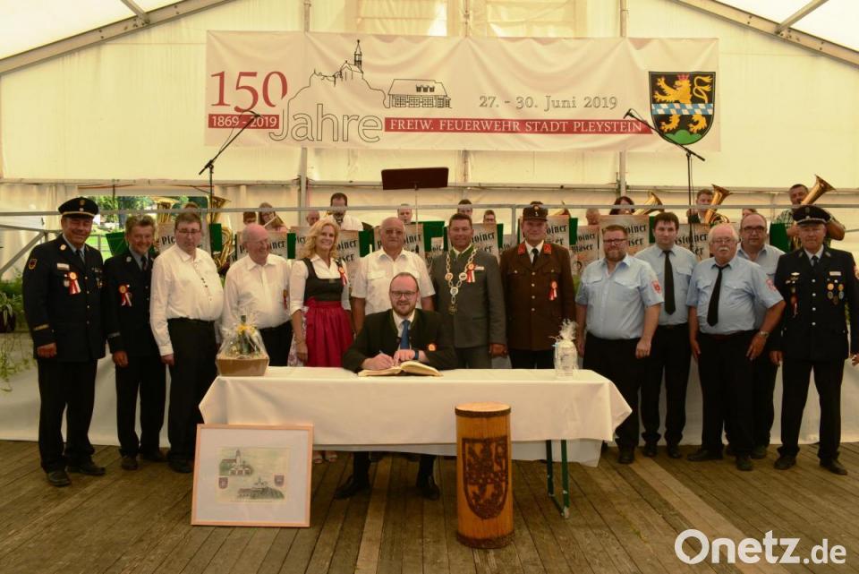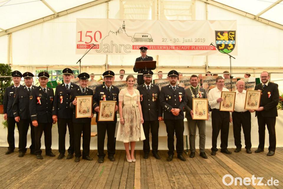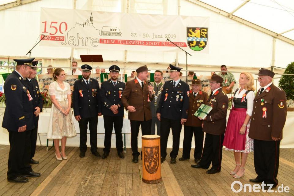 Stadtpfarrer Pater Hans Ring segnete das Fahnenband der Festbraut Julia Beugler. Danach heftete diese das Band an die Fahne der Pleysteiner Wehr an. Pater Haußner versicherte in seinem Schlusswort mit der Stadt Pleystein sehr eng verbunden zu sein. Beim anschließenden Frühschoppen im Festzelt begrüßte Festleiter und Ehrenkreisbrandinspektor Hans Rewitzer die Ehrengäste und die Vielzahl der Wehren. Ein besonderer Gruß galt der Wehr aus der Patengemeinde Gamlitz, der Wehr aus Bludenz (Vorarlberg), aber auch den Festdamen und der Festbraut der Feier zum 100-jährigen Bestehen der Wehr im Jahr 1969.