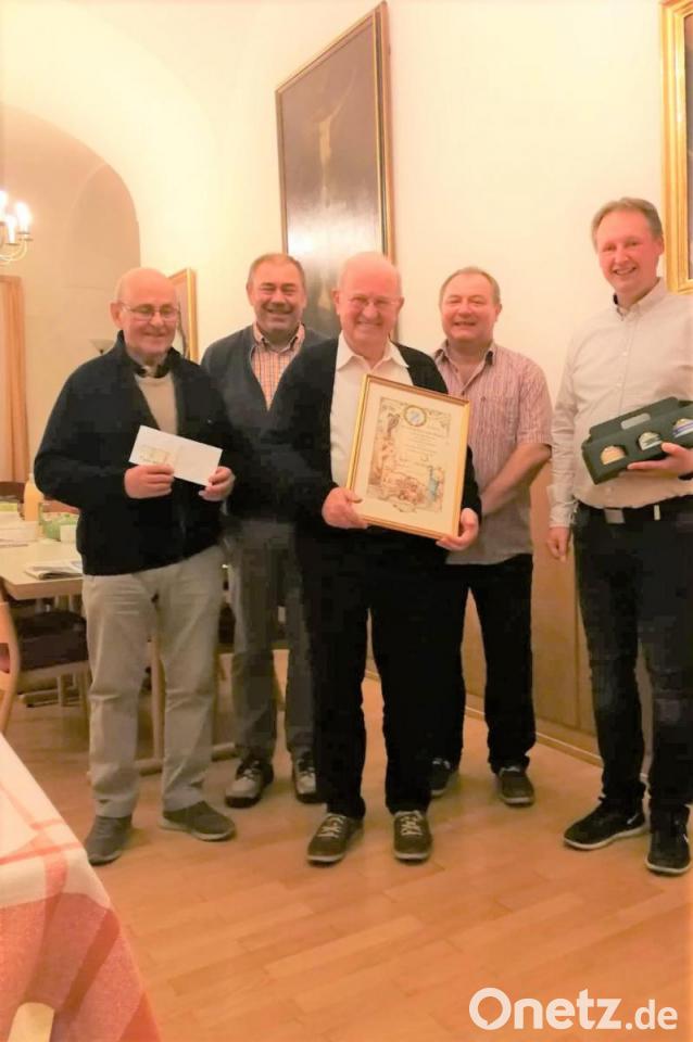 Nach dem Gottesdienst in der Kirche St. Anna überreichten Ehrenkreisbrandinspektor und Festleiter Hans Rewitzer, Schatzmeister Josef Preßl und Eventmanager Stefan Kabitschke im Namen der Wehr und des Festausschusses an Pater Konrad Haußner die Dankurkunde für seine Festpredigt zum 150-jährigen Gründungsjubiläum im Juni auf dem Kreuzberg am Freialtar und ein Geschenk.