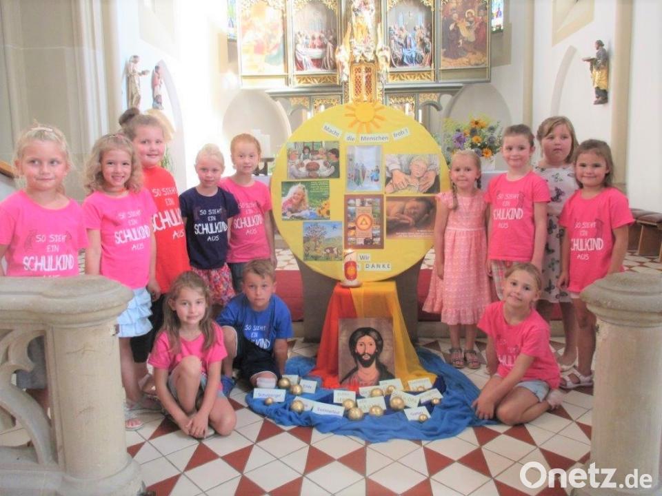 Stadtpfarrer Pater Hans Ring betonte, dass man zusammengekommen sei, um Gott Danke zu sagen. Mit dem Lied „Jeder Mensch will glücklich sein“ leiteten die Kinder zum Lukas-Evangelium von den zehn Aussätzigen über. Drei Kinder hielten dabei eine Bild-Rolle mit zehn Menschen hoch, und ein Kind präsentierte die Jesus-Ikone. Die Eltern der Schulanfänger sprachen die Fürbitten. Beeindruckt waren Kinder, Eltern, Großeltern, das Personal und all die anderen Gläubigen im Gotteshaus von der Geschichte für die Erwachsenen mit dem Titel „86 400 Euro“, vorgetragen von Schwester Maria und Erzieherin Beate Schuch.