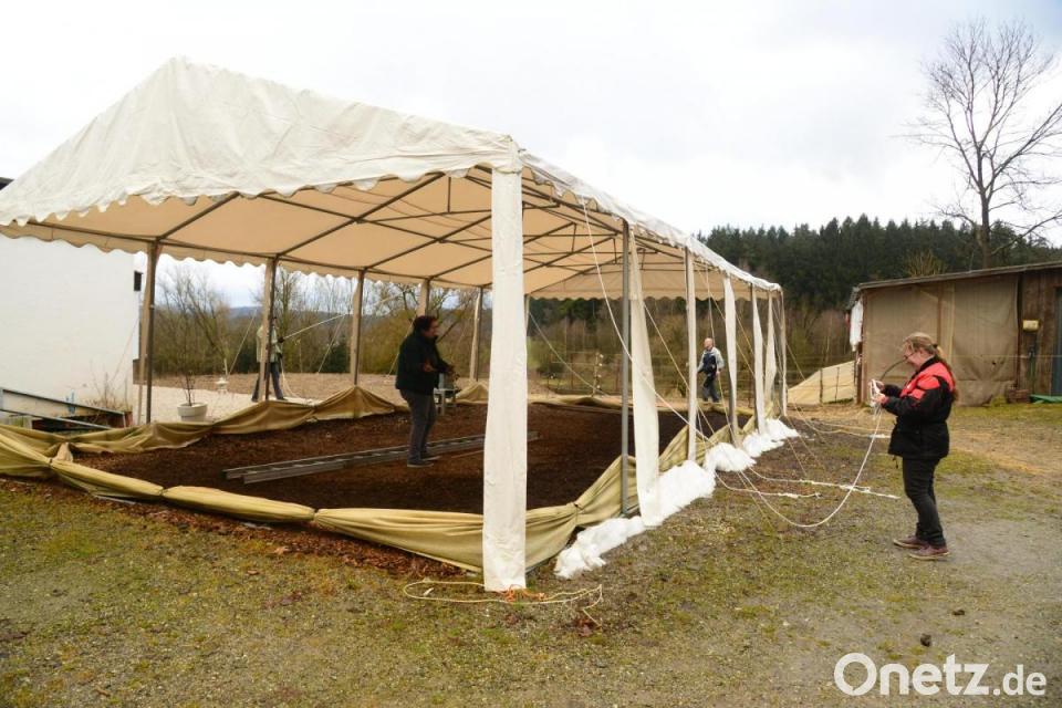 Wenn es Frühjahr wird, dürfen die Helfer wieder kommen und mit der Plane den umgekehrten Weg gehen. Jetzt sind Inez Dreyer und Patricia Beckmann erst einmal sicher, dass mögliche Böen aus Süden und Südwesten ihrem Gut Windrose nichts anhaben können.