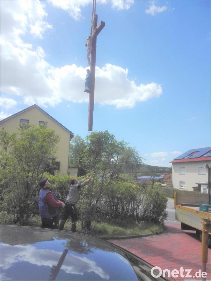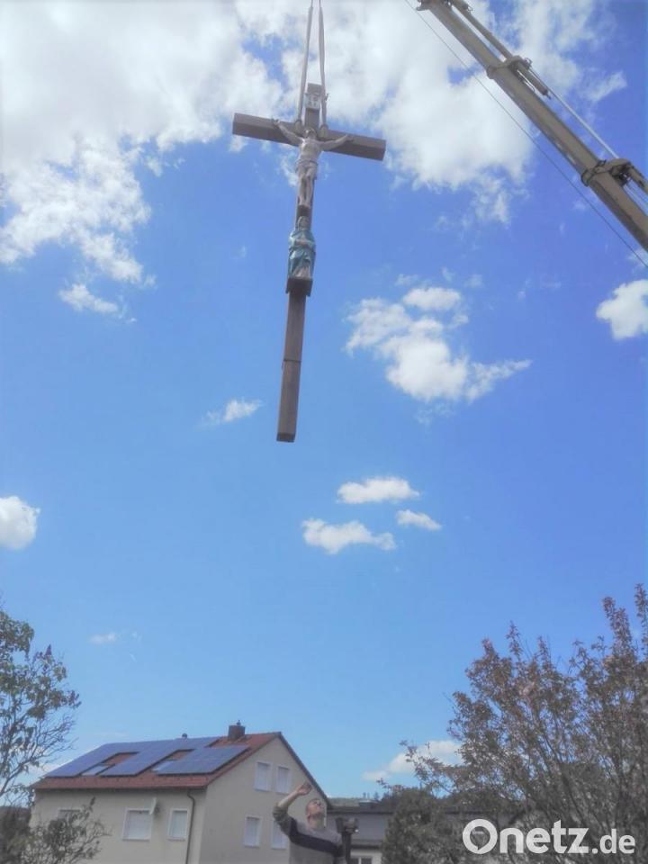 Sie gestaltete die schweren Figuren aus Gusseisen, die zusammen über 100 Kilogramm wiegen und die laut durchgeführten Recherchen um 1860 in der Eisengießerei Bodenwöhr gefertigt worden sind, kunstvoll farblich neu. Auch die Holzbalken wurden erneuert. Am Mittwoch wurde das sogenannte „Schlosser-Kreuz“ mit Hilfe eines Kranwagens in frischem Glanz an seinem Standort wieder aufgestellt. Die Eigentümerfamilie Reber freut sich über die gelungene Renovierung ihres sakralen Kleinods, das nun in neuer Pracht die Blicke der Spaziergänger auf sich ziehen wird.