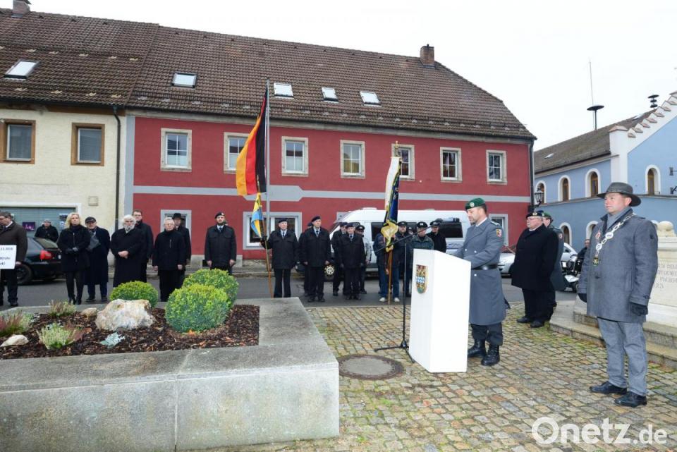 Major Olaf Niederdräing, Kompaniechef der Ausbildungsunterstützungskompanie 122 Weiden, nannte Wachsamkeit einen Faktor für Freiheit und Frieden, der von der Bundeswehr mit ihren Soldaten gewährleistet werde. Der Blick in die letzten 100 Jahre zeige aber, dass Menschen auf der ganzen Welt um Freiheit, Recht und Frieden gekämpft und dafür mit ihrem Leben bezahlt haben. Der Offizier bedauerte, dass gefallene Soldaten und auch Einsätze der Bundeswehr immer wieder Objekt von Verurteilungen oder Anfeindungen seien. Dabei werde vergessen, dass hinter jedem Soldaten das Schicksal eines Menschen und seiner Angehörigen stehe.