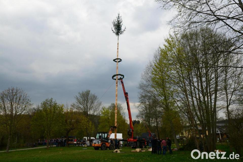 Im zweiten Anlauf hat es geklappt. Der Maibaum der Katholischen Jugend Pleystein ist aufgestellt. Rund 26 Meter bis zur Spitze ist der Baum hoch. Mit Hilfe eines Krans und eines Frontladers wurde der Baum in seine Halterung gehoben. Nach der missglückten Aufstellung am Samstagnachmittag hatten sich am Sonntagnachmittag am Herrenpoint-Weiher wesentlich mehr Zuschauer als tags vorher eingefunden, um dieses Ereignis zu erleben. Über Nacht hatten die Mitglieder der Katholischen Jugend einen neuen Baum aus dem Wald geholt, geschält und sogar noch verziert. Kurzum ein Schmuckstück, das wieder für eine begrenzte Zeit die Grünanlage am Herrenpoint-Weiher bereichern wird.