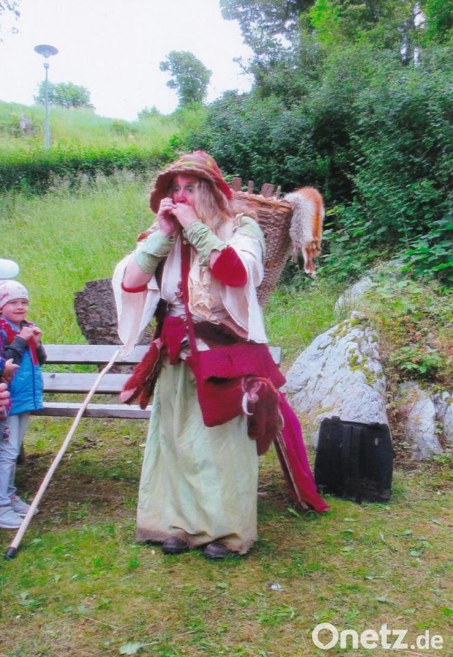 Gesponsert wurde dieser Auftritt von zwei Gönnern des Kindergartens mit ansehnlichen Geldspenden. Da sich der Kreuzberg auch für solche Aufführungen mit seiner Idylle geradezu anbietet, war die Frage, wo diese Aktion stattfinden soll, schnell geklärt. Bei herrlichem Sommerwetter hieß Wurdack am Fuße des ehemaligen Schlossberges 45 erwartungsvoll dreinblickende Mädchen und Buben sowie deren Erzieherinnen willkommen. Als lustige Waldschratin „Pimpernella Pumpelsack“ verkleidet machte sie sich mit ihnen auf den Weg hinauf zum Plateau des Rosenquarzfelsens.