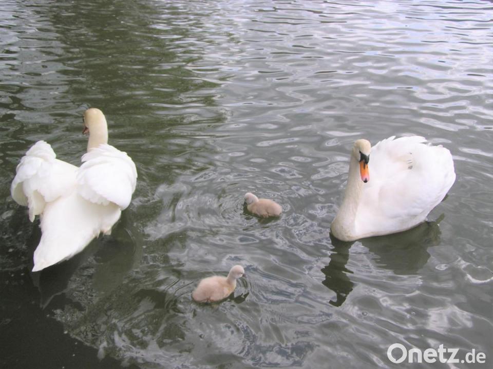 Am Donnerstag gegen 16 Uhr tummelten sich die Jungschwäne zum ersten Mal im Stadtweiher. Der stolze Schwanenvater ist als Beschützer immer in der Nähe. Er unternimmt nun zusammen mit der nicht minder wachsamen Schwanenmutter und dem Nachwuchs wieder seine gewohnten Runden im ehemaligen Schlossteich am Fuße des Kreuzberges. Dabei zieht vor allem das kleine Schwanenduo die Blicke der Einheimischen und der Gäste auf sich.