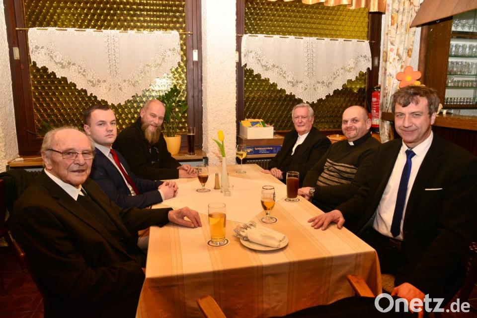 Würzburgs Altbischof Friedhelm Hofmann feierte mit Pater Reinhold Schmitt, Pfarrer Klaus Oehrlein und Bors Geistlichem Monsignore Miroslav Martis am Sonntag in Pleysteins Partnerstadt Bor den regelmäßigen deutschsprachigen Gottesdienst. Die Heimreise nach Würzburg unterbrach Hofmann (hinten, rechts) auf Einladung von Pater Schmitt (links) zu einer Brotzeitpause im Pleysteiner Hotel „Regina“. Mit dabei waren Pfarrer Oerlein (hinten, links) und Martis (Zweiter von rechts).