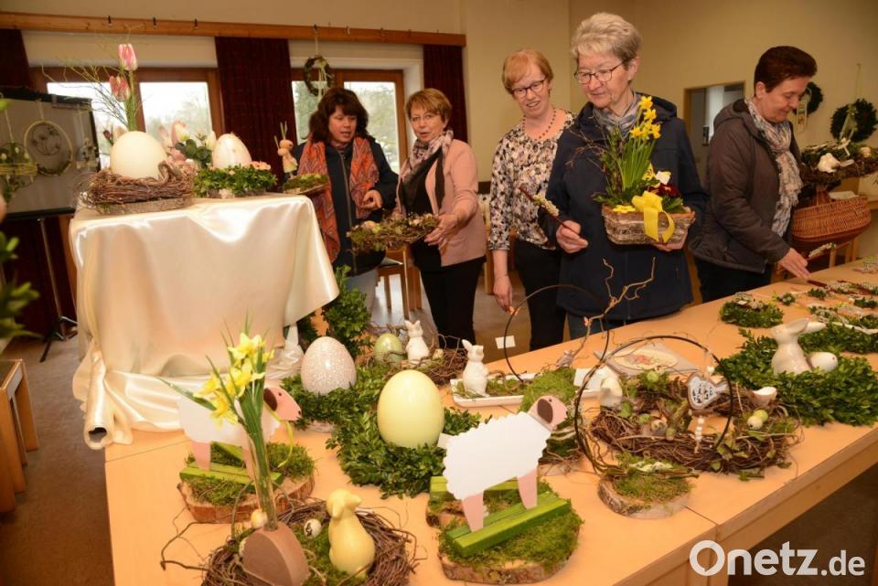 Die Katholische Frauengruppe lud am Samstag zu ihrem Osterbasar ins Katholische Pfarrheim ein. Seit Jahren wissen die Bürger, welch wunderschöner Osterschmuck bei diesem Basar angeboten wird. Dementsprechend war der Andrang schon bei der Eröffnung groß. Palmringe, Palmkreuze aus feinen Kanthölzern oder geraden, zusammengebundenen Ästen, weiße kleine Porzellan-Osterhasen inmitten von Grün, Osterhasen mit Eierkorb und selbstverständlich auch Osterlämmer fanden das große Interesse der Besucher.
