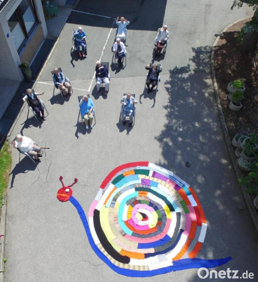 Dem Aufruf der Stiftung „Sonnenblume“ in Irchenrieth, den längsten Schal der Oberpfalz zu stricken, schlossen sich zwölf Gäste der Caritas-Tagespflege „Rosenquarz“ an. Wegen Corona wurde zwar die Tagespflege geschlossen, aber auch in dieser Zeit waren die „fleißigen Bienen“ nicht tatenlos und strickten zu Hause emsig weiter. Nun präsentierten die Angestellten und die am Projekt beteiligten Strickerinnen im Hof der Tagespflege das Ergebnis, das über einen Kilometer lang ist und in Form einer fröhlichen Schnecke entsprechend präsentiert wurde.