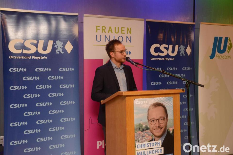 CSU-Bürgermeister- und Stadtratskandidat Christoph Müllhofer stellte seinen beruflichen Werdegang bei der BHS in Weiherhammer sowie sein langjähriges politisches und ehrenamtliches Engagement vor. Der Verzicht des amtierenden Bürgermeisters Rainer Rewitzer auf eine weitere Amtszeit habe ihn zur Kandidatur bewogen. Als wichtige Ziele nannte Müllhofer unter anderem den Städtebau, den Aufbau eines Nahwärmenetzes sowie die Ausweisung von Bauland für junge Familien sowie die Förderung von Schule und Kindergarten. Ein besonderes Anliegen sei ihm, sich für die Sanierung des Freibads einzusetzen, auch wenn die finanzielle Lage angespannt sei. Zudem wolle er der Wasser- und Abwasserversorgung hohe Priorität einräumen. „Es lässt sich viel erreichen, auch wenn wir jeden Cent vor dem Ausgeben zweimal umdrehen müssen, und dafür braucht es ein starkes Team, das gut zusammenarbeitet“, betonte Müllhofer unter großem Beifall der Gäste.