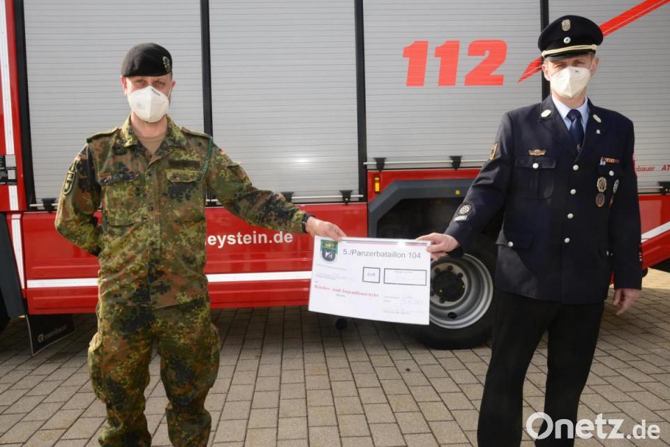 Die 5. Kompanie des Panzerbataillons 104, per Patenschaft eng mit der Stadt Pleystein verbunden, übergab durch Kompaniechef Oberleutnant Olaf Niederdräing den Feuerwehren in der Großgemeinde für die Jugendarbeit den stolzen Betrag von 1500 Euro.