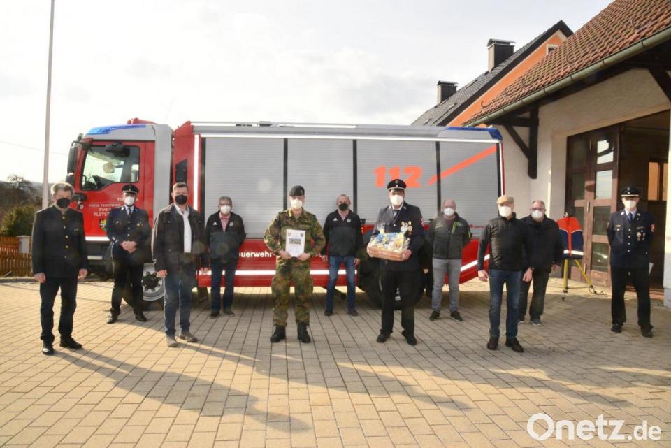 Er beließ es deshalb bei der Überreichung einer von ihm selbst und den Vorsitzenden der Feuerwehr Pleystein, der Reservistenkameradschaft, des TSV Pleystein, des Männergesangvereins 1895 und des Kriegervereins unterschriebenen Dankurkunde. Diese soll an einer Zimmerwand ihren Platz finden. Dazu gab es für den Major ein „Genusskörberl“ aus der Öko-Modellregion.