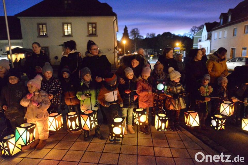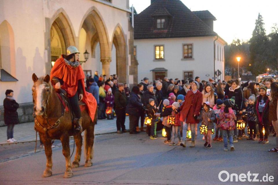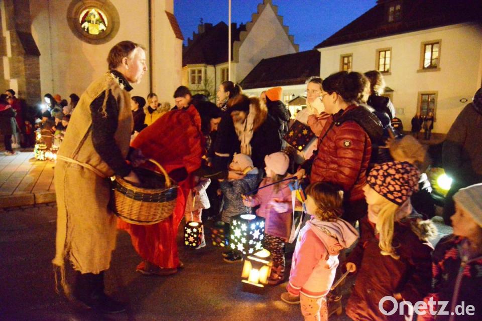 Nach der Andacht zogen der heilige Martin hoch auf dem Pferd, diesmal dargestellt von Carina Fischer und die Kinder, deren Eltern und viele Besucher der Andacht im Laternenzug durch die Kreuzberganlage und die Altstadt. Eine Bläsergruppe der Stadtkapelle begleitete den Zug. Nach der Rückkehr an die Stadtpfarrkirche verteilten St. Martin und der Bettler an die Kinder kleine gebackene Martinsgänse, die von den Mitarbeiterinnen im Kindergarten selbst gebacken worden waren.
