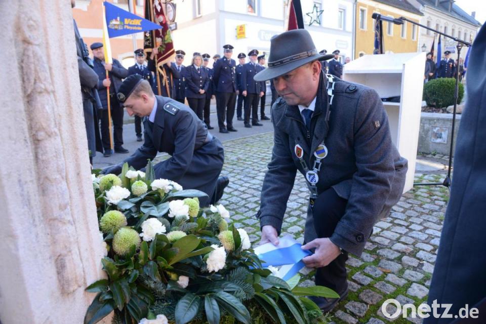 Nach Beginn des Krieges in der Ukraine seien Leid und Schrecken für viele Menschen wieder zum Alltag geworden. Es bleibe nur die Hoffnung, dass Menschlichkeit, Freiheit und Vernunft wieder die bestimmende Maxime werde, schloss Oberleutnant Martin Gläser seine Ansprache. Im Anschluss legten Bürgermeister Rainer Rewitzer und Oberleutnannt Martin Gläser Kränze am Kriegerdenkmal nieder.