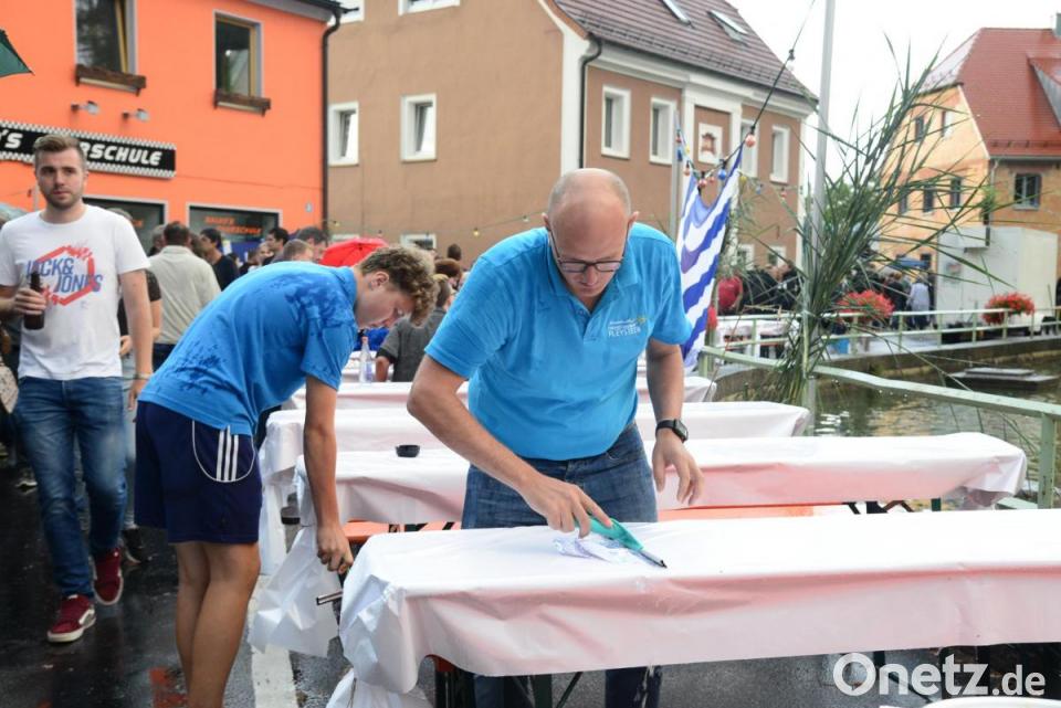 Die Besucher, in ihrer Mehrheit von auswärts, suchten Schutz unter Schirmen, Bäumen, den Zelten, Hauseingängen, ja selbst in einer geöffneten Fahrschule oder einer anderen einfachen Überdachung. Nach dem Regenguss war dann an manchen Ständen „trocken legen“ im Akkord angesagt. Viele der Plätze waren nach dem Regen wieder so belegt wie vorher, auch deshalb, weil eine große Zahl von Gästen ohnehin erst nach dem Regenschauer kam. Die Straßen Pleysteins, die Parkplätze in Stadtnähe waren jedenfalls belegt wie selten.