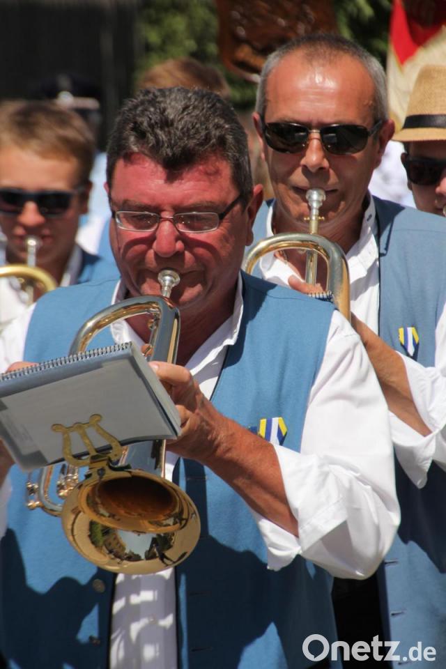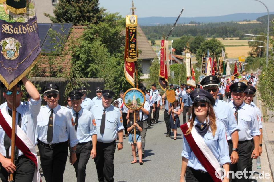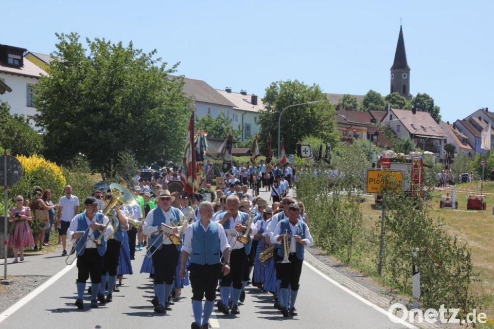 Am Sonntagmittag setzte sich ein Festzug mit neunzig Vereinen aus den Landkreisen Tirschenreuth und Neustadt/WN - natürlich überwiegend Feuerwehren - in Bewegung. Auch die Feuerwehr der polnischen Partnerstadt Goczalkowice-Zdroj war dabei. Die sieben Blaskapellen mit der "Flossenbürger Blaskapell'n", der Pirker Blechmusik, den "Grenzlandbuam Bärnau", der Jugendblaskapelle Reuth, der Blaskapelle Thanhausen, der Großkonreuther Blasmusik sowie den Neuhauser Buam, sorgten für Marschmusik. Damit zog sich der bisher wohl größte Festzug in diesem Jahr im Stiftland durch Plößberg - und dies bei heißen Temperaturen von rund 35 Grad.