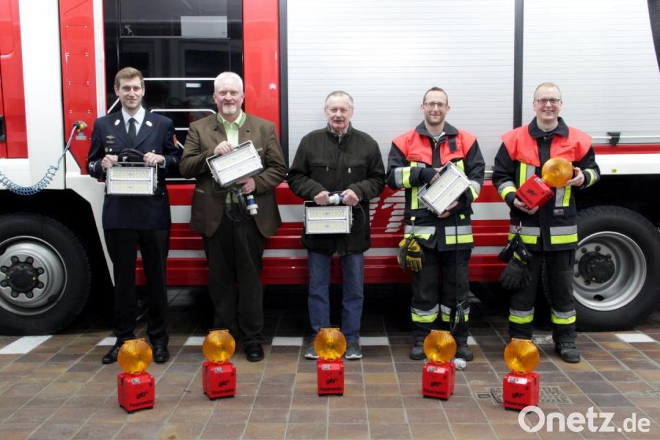 Im vergangenen Jahr hatte die Feuerwehr Plößberg größere Anschaffungen hintenangestellt, damit man sich auf die Organisation des Jubiläumsjahres konzentrieren konnte. Nun kamen die Vorsitzenden des Feuerwehrvereins und des Fördervereins zusammen, um der Führung der aktiven Wehr neue LED-Strahler für den Lichtmast des LF 20 und Blitzlichter für die Verkehrsabsicherung zu übergeben.