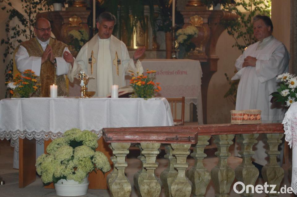 Nach dem Empfang ging es in die nahe Kirche zum Festgottesdienst mit Pater Miroslav Martia und Pater Martin Vána. Martia begrüßte zum Gottesdienst besonders die mitwirkenden Zelebranten, die Abordnung aus Plößberg und weitere Gästen aus Deutschland, wie ehemalige Bewohner von Staré Sedlo. Die Lesungen, Fürbitten und Gebete wurden sowohl in tschechisch als auch in deutsch gesprochen. In deutscher Sprache wurden mit Begleitung der Blaskapelle Lieder gesungen, dazwischen wurde immer wieder eine Strophe aus einem Marienlied gesungen - dann wieder in tschechischer Sprache. Der Kirchenchorgemeinschaft aus Stráz und Staré Sedlo gestalteten den Gottesdienst auch gesanglich.
