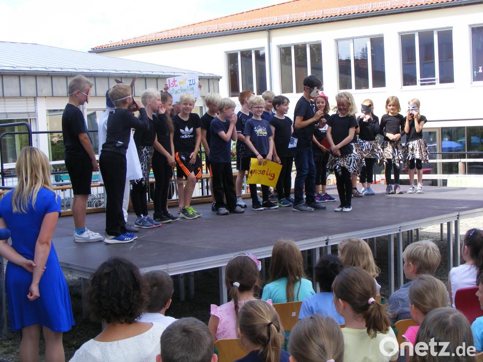 Die Schüler zeigten ein abwechslungsreiches Programm. So startete die 1. Klasse nach der Begrüßung durch Konrektor Willi Lohwasser mit einem Fitmach-Lied, die 2. Klasse führte einen Katzentatzentanz auf, die beiden 4. Klassen sorgten dazwischen mit musikalischen Beiträgen, etwa mit Ukulelen und lustigen Liedern, für Stimmung.