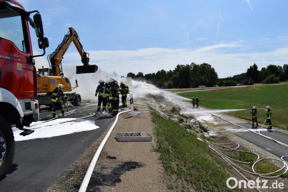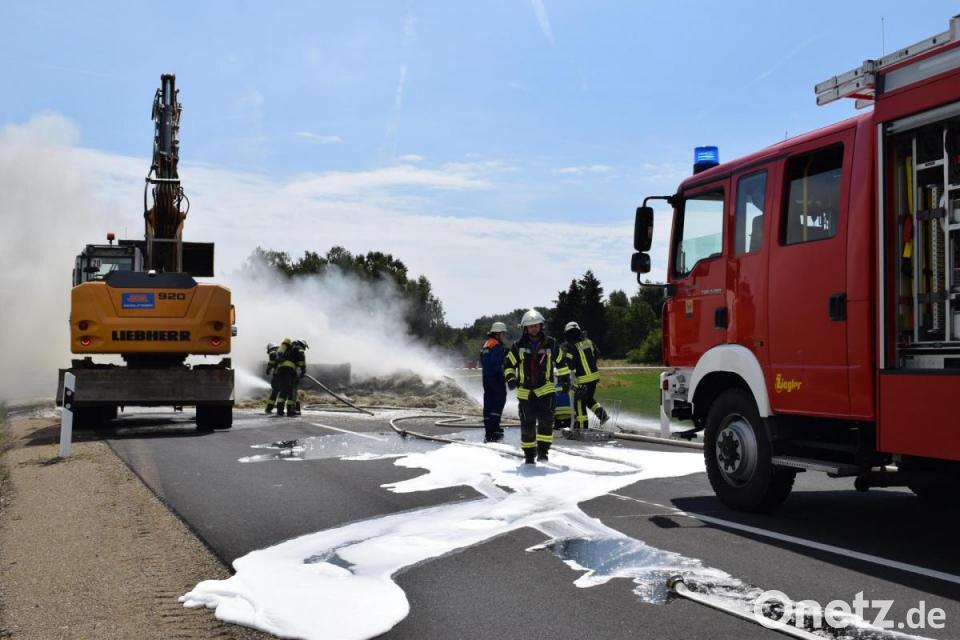 Zu einem Brand einer landwirtschaftlichen Maschine rückten die Feuerwehren am Donnerstagmittag bei Plößberg aus. Ein Landwirt war mit einem vollbeladenen Tieflader auf der Kreisstraße TIR12 von Beidl kommend Richtung Plößberg unterwegs, als sich das geladene Stroh entzündete. Bei den Feldarbeiten muss sich auf der Ladung ein Funke eingenistet haben, der sich durch den Fahrtwind entzündet hat, heißt es von der Polizei vor Ort. Es entwickelte sich starker Rauch. Dies fiel dem Fahrer des Traktors gegen 11.15 Uhr auf. Auch einige weitere Passanten alarmierten die Einsatzkräfte. Kurz vor dem Kreisverkehr nördlich von Plößberg blieb der Fahrer stehen und koppelte den Traktor vom Anhänger ab. Als die Einsatzkräfte der Feuerwehren Plößberg, Beidl, Schönkirch und Floß eintrafen, brannte der mit Stroh beladene Anhänger bereits. Verletzte gab es nach ersten Erkenntnissen keine.