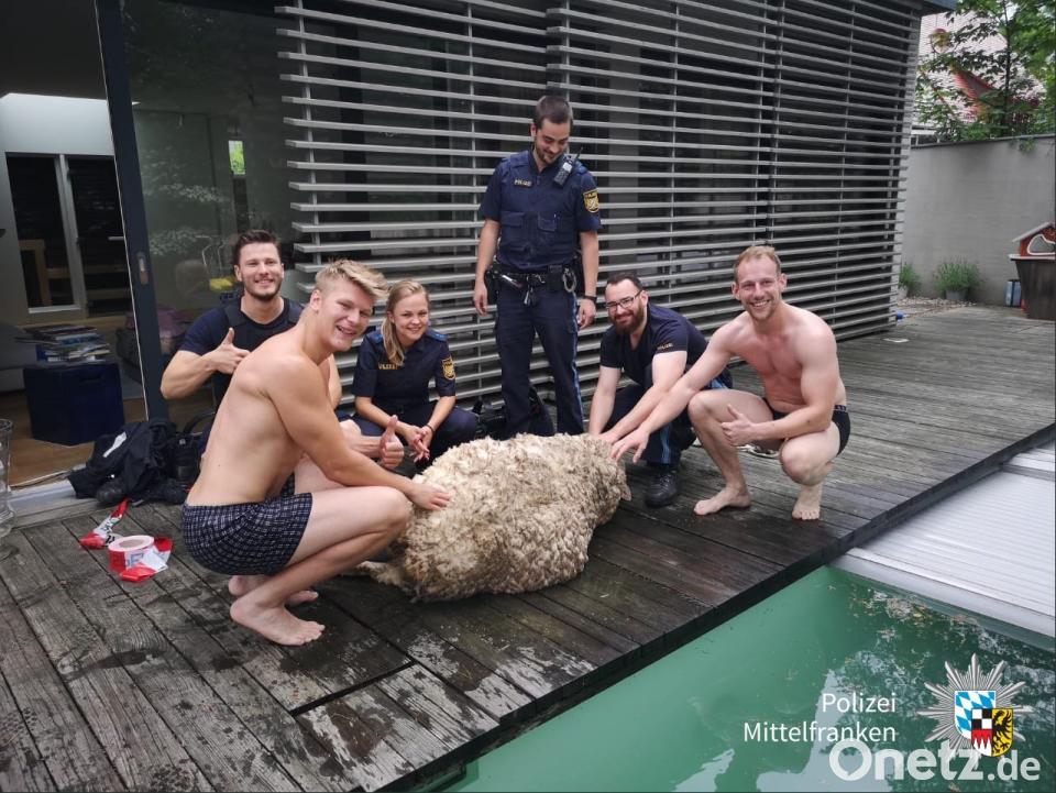Bei der Hitze möchte sich jeder abkühlen, auch Tiere. In Mittelfranken sprang ein Schaf in einen Pool. Wie die Polizei auf Twitter mitteilt, gab's da nur ein großes Problem: Die Schafswolle saugt sich mit Wasser voll, das Schaf droht unterzugehen! Die Polizei musste helfen. Aber in Uniform sprangen die Beamten nicht ins Wasser, sie zogen sich aus bis zur Unterhose. Dann retteten sie das Tier aus dem Pool. Die besonders gute Nachricht: Das Schaf war trächtig, kurz darauf gebar es drei Lämmer. Und laut dem Twitter-Account der Polizei Mittelfranken auch nicht schlecht: Die zwei Polizisten konnten sich bei der Hitze abkühlen.