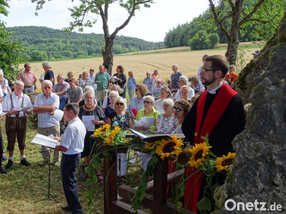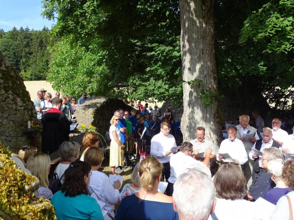 Wie seit Jahrhunderten Brauch, zog an ihrem Kirchweihsonntag die Festgemeinde aus Arzlohe unter den Klängen der vereinten Posaunenchöre Hartmannshof, Hohenstadt und Pommelsbrunn sowie unter der Stabsführung von Katharina Polster in einer Prozession vom Dorf in die Kapellenruine ein. Bei strahlendem Sonnenschein feierte die beachtliche Schar an Gläubigen den Geburtstag des altehrwürdigen Gemäuers. Dabei durfte die Dorfgemeinschaft dem Männergesangverein Pommelsbrunn unter der Leitung von Einhard Lauffer-Königer und dem evangelischen Kirchenchor Pommelsbrunn unter der Leitung von Deborah Reichel lauschen.