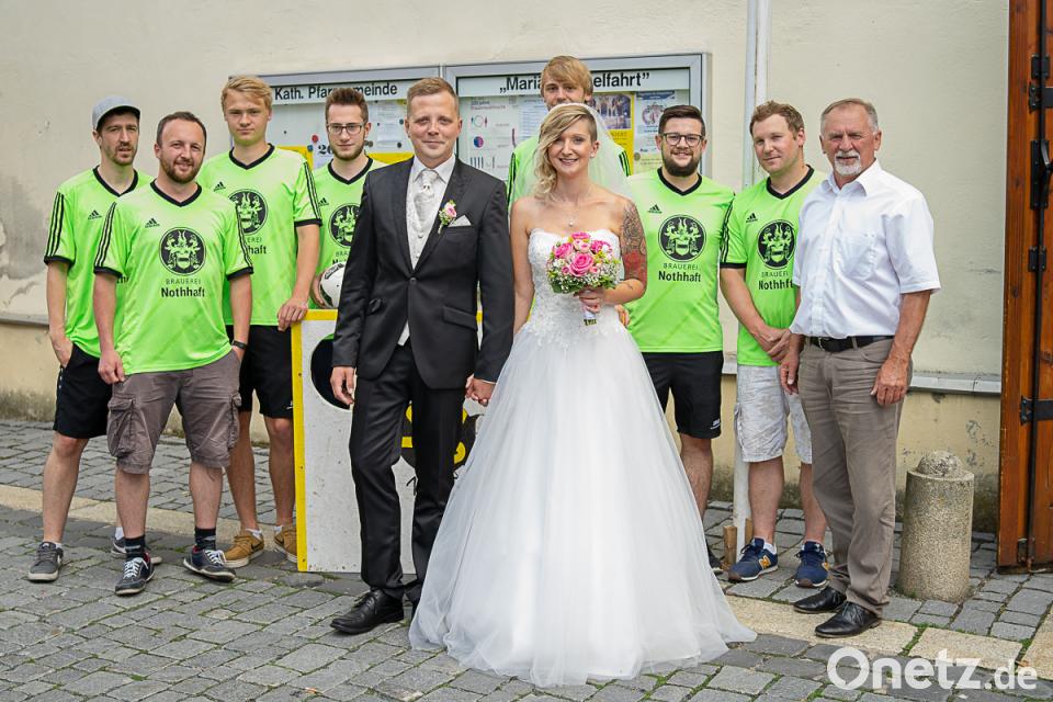 Den Trauungsgottesdienst zelebrierte Pfarrer Konrad Amschl. Für die musikalische Umrahmung sorgte der Kirchenchor. Nach der Trauung überraschten die Fußballer des SV Poppenreuth das Brautpaar mit einem Spalier.