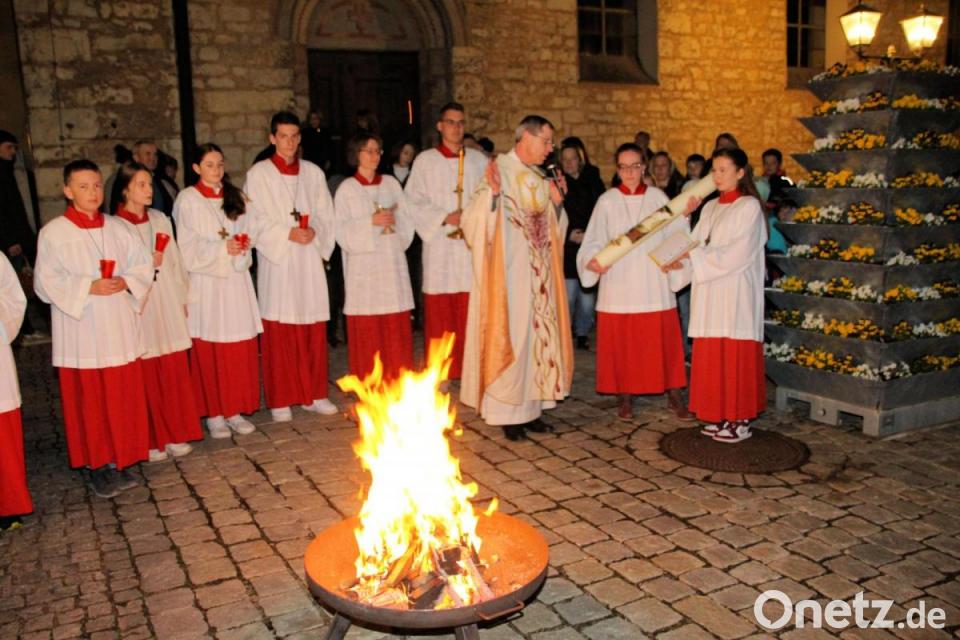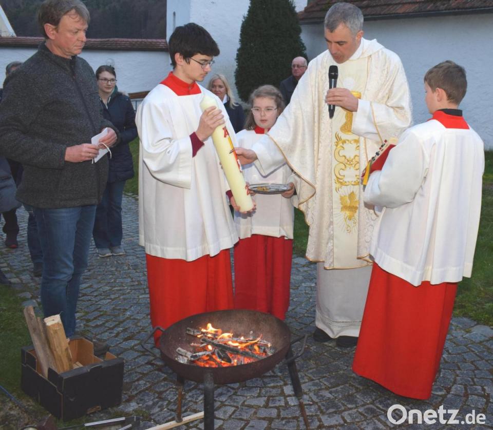 Nach alter Überlieferung postierten sich in Schmidmühlen Ministranten zur Osternacht rund um die Pfarrkirche und machten mit ihren Ratschen auf den Beginn des Gottesdienstes aufmerksam. Pfarrer Werner Sulzer versammelte am Kirchplatz die Ministranten und Kommunionkindern zur Feuerweihe um sich. Die Osterkerze wurde am Feuer entzündet und dann in das finstere Gotteshaus getragen. Die Ministranten gaben das Licht dann an die Besucher weiter.