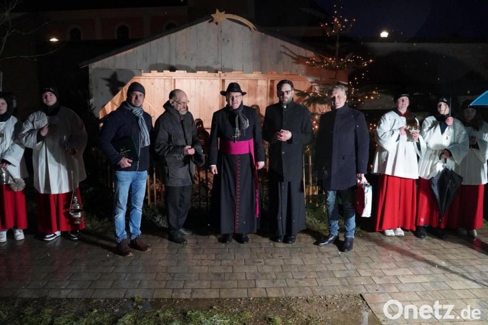 Eine besondere Überraschung war, dass sich Bischof Rudolf Voderholzer nach einem Termin in Amberg für die Segnung der Außenkrippe Zeit nahm. Gut 30 Ministranten, Gemeindereferentin Regina Probst, Pfarrer Dominik Mitterer, Kirchenpfleger Stefan Hüttl, Pfarrgemeinderats-Sprecher Reiner Hoffmann und eine Schar von Gläubigen fanden sich am Poppenrichter Dorfplatz ein und nahmen den Regensburger Oberhirten in Empfang. Pfarrer Mitterer bedankte sich bei allen Spendern.