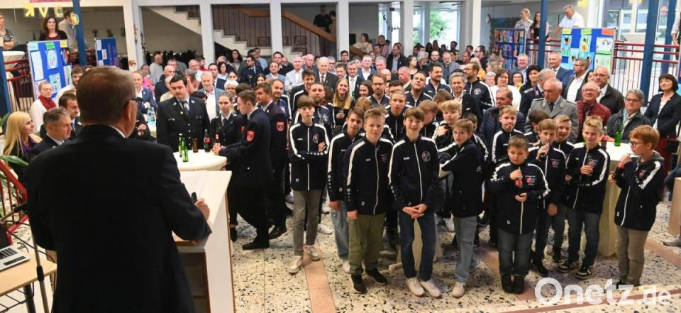 Luca Schober, Manuel Ott, Moritz Pischel und Georg Böhm – „DeyvomDorf“ nennen sie sich – spielten, während sich die Aula der Grundschule allmählich füllte, bis Bürgermeister Hermann Böhm seine Gäste aus Wirtschaft, Politik, Kirche und dem Vereinsleben willkommen hieß.