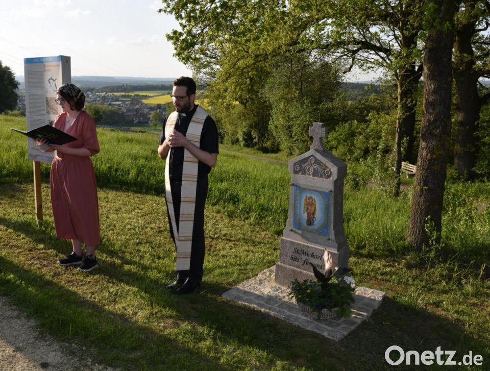 Schnell erklärte sich eine Gruppe von über 20 Personen bereit, sich finanziell zu beteiligen. Auch Pfarrer Dominik Mitterer zeigte sich sofort begeistert von der Idee. Der Amberger Steinmetzbetrieb Justus stellte kostengünstig einen passenden Stein zur Verfügung. Der Poppenrichter Kunstmaler Erich Graf fertigte das Bild des Pfarrpatrons, des Erzengels Michael nach dem Motiv der historischen Poppenrichter Burschenvereinsfahne. Nachdem der Landschaftsbaubetrieb Bernd Lang im Frühjahr 2022 den Stein gesetzt hatte und der Platz gefällig gepflastert war, erfolgte nun in einer Andacht die Einweihung.