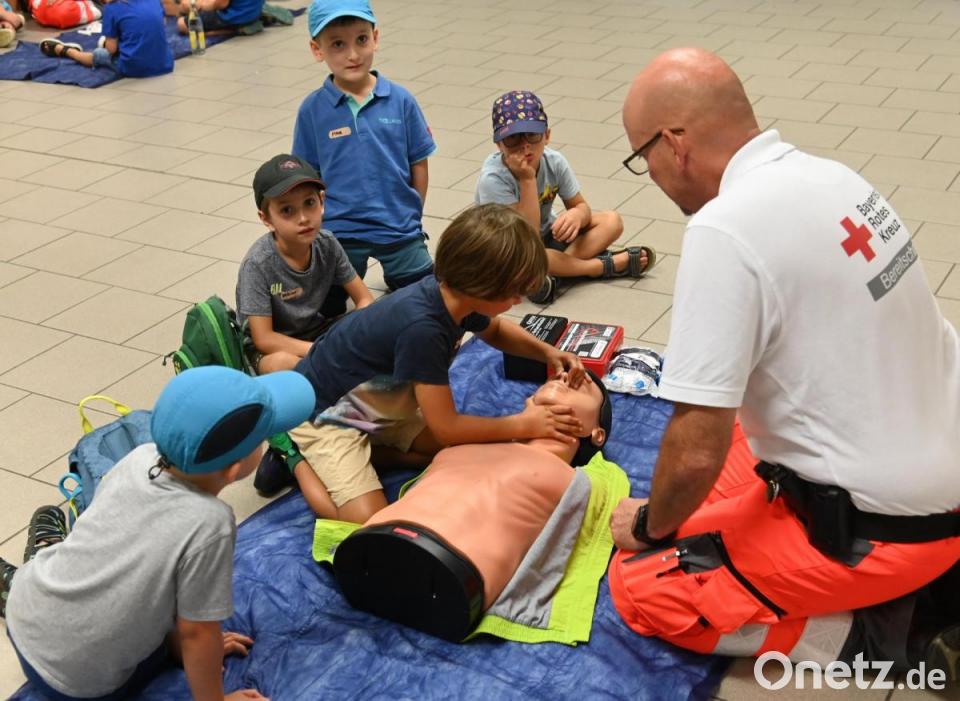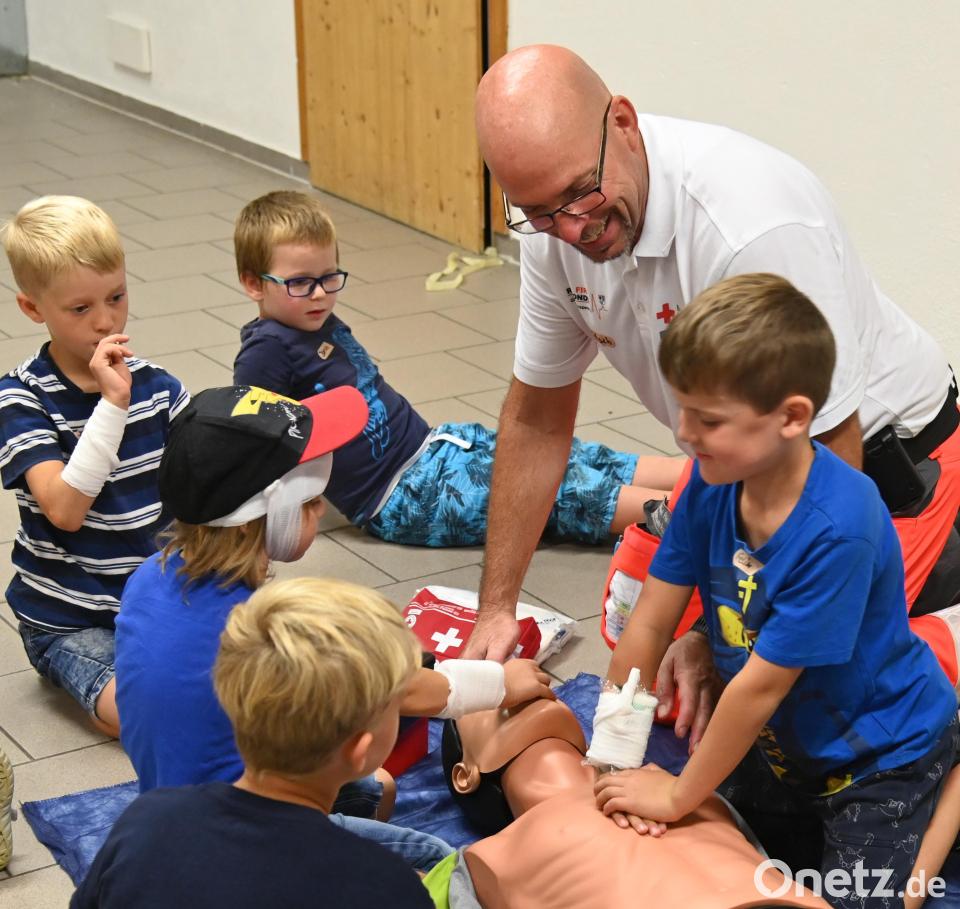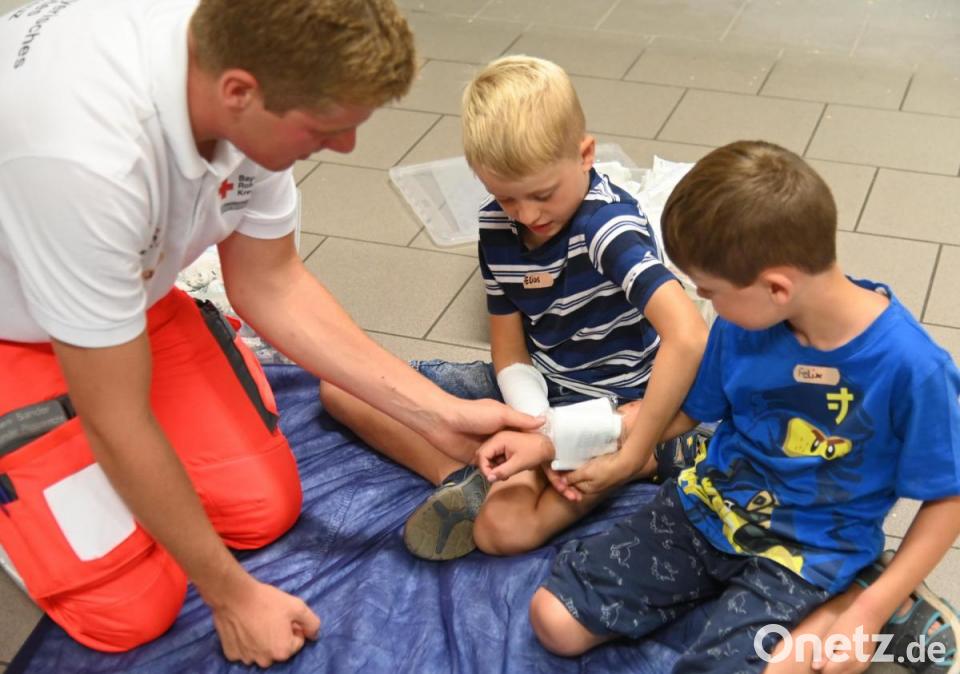 Poppenrichter Kinder üben Herzdruckmassage und Kopfverband