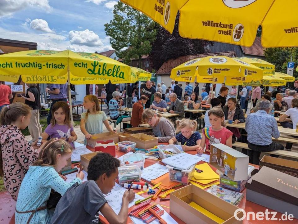 Im Anschluss an den Gottesdienst konnten sich die Besucher am Dorfplatz stärken. Neben Bratwürsten und Steaks gab es für die Vegetarier Zwiebelkuchen und Grillkäse. Der offene Frauentreff bot zum Kaffee ein reichhaltiges Kuchenbuffet an. Die KAB organisierte den Käsestand und verkaufte auch Schokobananen. Die Ministranten boten zugunsten ihrer Rom-Wallfahrt Bubble-Tea, Popcorn, Eis und Lose an. KLJB, DPSG und Minis kümmerten sich um den Ausschank. Besonders viel Spaß hatten die Kinder mit dem Glücksrad. Am Basteltisch von Gemeindereferentin Regina Probst konnten die Kinder eine „Kirche im Schuhkarton“ gestalten.