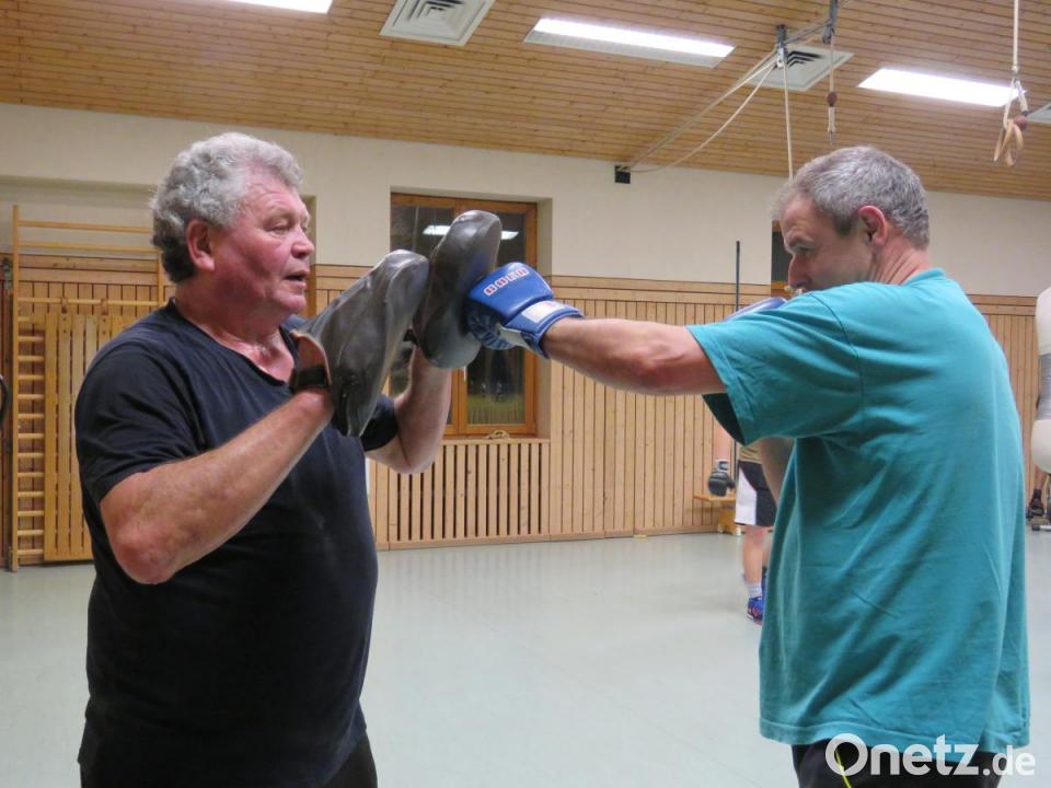 Zur Technik sagt er, diese sei nicht schwer. Man müsse nur auf die richtige Stellung der Handgelenke achten. "Wer mitmachen will, muss im TSV Mitglied werden. Wegen der Versicherung." Aber das Boxtraining sei natürlich nicht gefährlich. In über 30 Jahren sei nie was passiert. Easy sei es, das Zubehör anzuschaffen. Alles ist vorhanden, die Teilnehmer bringen nur Sportkleidung mit. Willi Dietz erklärt, was nötig ist. "Pratzen" zum Beispiel. Das seien spezielle Trainingshandschuhe. Die zieht er über. Sein erster Sparringspartner, Gerhard Lösch, bekommt die Boxhandschuhe angezogen. Die habe er alle aus Pressather Zeiten herübergerettet. Wie die Sandsäcke, berichtet Willi Dietz.