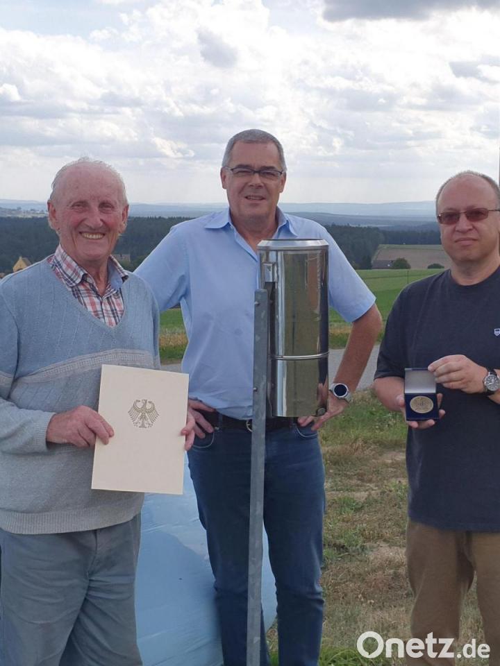 Johann Selch erfasst und notiert seit 1997 im Auftrag des Deutschen Wetterdienstes (DWD) als ehrenamtlicher Wetterbeobachter das Wetter in Mühlberg (Gemeinde Pressath). Der Bundesminister für Digitales und Verkehr, Volker Wissing, hat ihm, wie der DWD mitteilt, nun als Dank für sein 25-jähriges ehrenamtliches Engagement die Wetterdienstplakette verliehen. Die Auszeichnung wurde Selch von Detlef Aßmann, Leiter der Regionalen Messnetzgruppe des DWD in München, und Betreuer Frank Sievers überreicht.