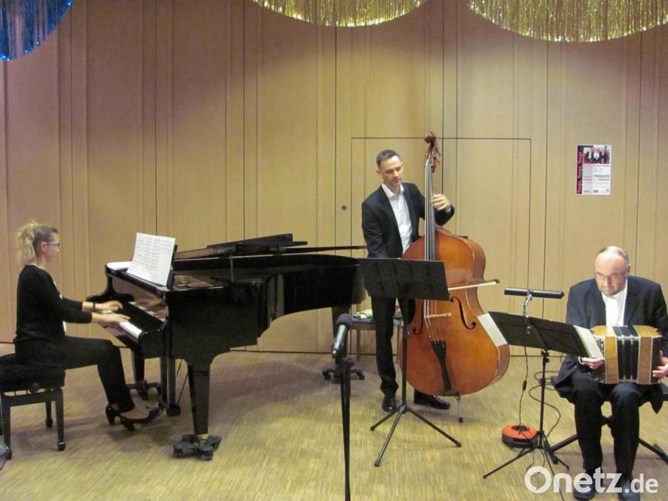 Die Zusammensetzung des Trios mit Tatjana Kwint am Flügel, die eingangs kraftvoll einen Tango als eine Art Intrada solo vorstellte, dem Kontrabass, der von Tobias Kalisch souverän nicht nur zum Streichen und Zupfen, sondern auch als Schlagwerk eingesetzt wurde, und dem Bandoneon, das sich Norbert Gabla nach eigenen Vorstellungen herstellen hat lassen, um die umfangreiche Gestaltungs- und Ausdrucksvielfalt mit zehn Fingern aus dem Balg und der filigraneren Zunge als beim Akkordeon herauszuholen. An diesem von Deutschland nach Argentinien und Uruguay importierten Instrument brillierte er und erschloss dem staunenden Publikum den Geist des wahren Tangos mit vibrierendem Piano bis zum letzten Ton oder Trommeleffekten. Das war ergreifend und nachwirkend beim meditativen „Ave Maria“ von Piazzolla im gebetartigen „Tanti Anni Prima“ intensiv zu erleben.