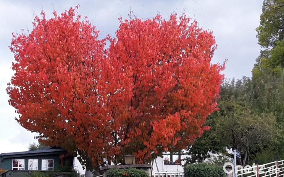 Die Natur ist eine Künstlerin: Dieser Baum in Pressath stellt es in leuchtendem Rot und in Form eines Herzens unter Beweis. Das Herbstlaub des „Herzbaumes“ lädt alle Verliebten zum Verweilen ein. Da kommen Herbstgefühle auf.
