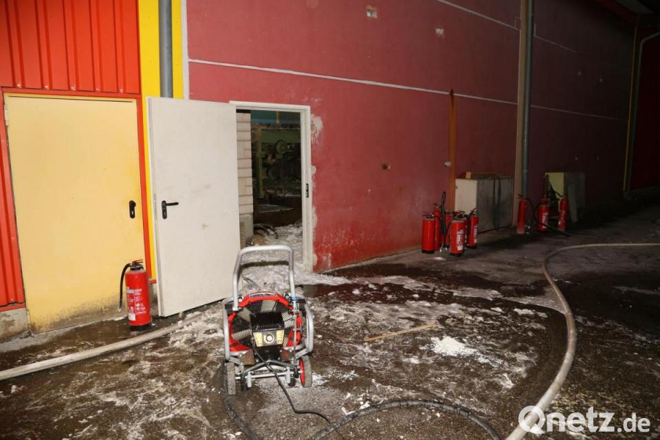 Mit einem Lüfter bläst die Feuerwehr den Rauch aus der Halle, in der die Industrie-Hobelmaschine brannte.