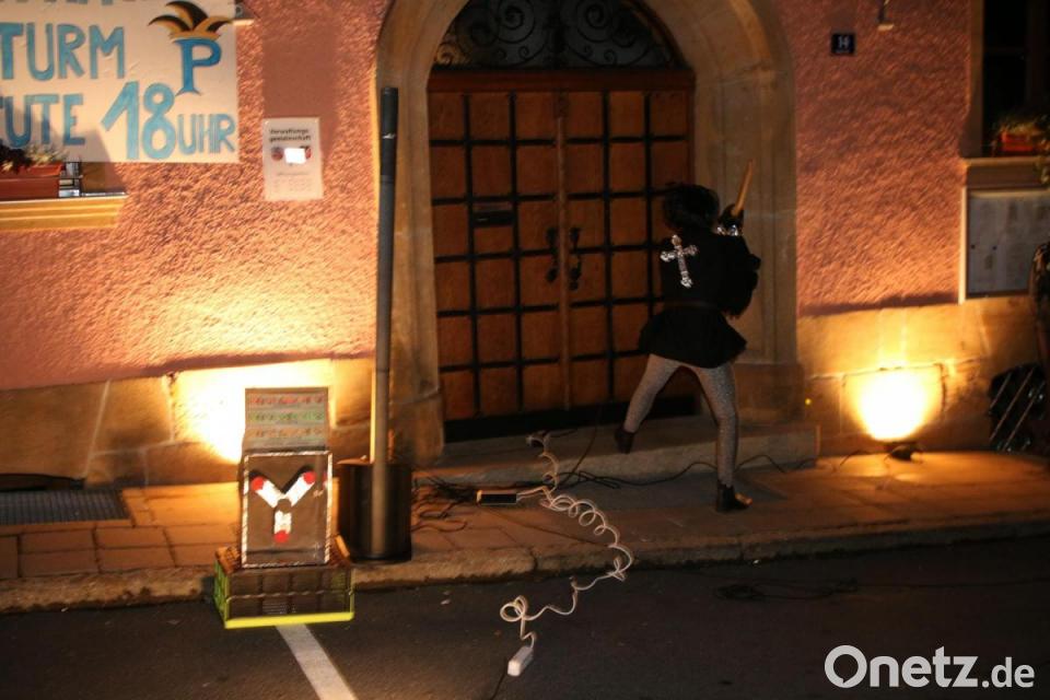 Dominik Kormann hatte aber schon eine Idee, die Pforte zu öffnen. Eine Zeitmaschine sollte historische Figuren in die Gegenwart bringen: "Wenn wir jetzt am Zeitrad drehen, können wir alle möglichen Helfer sehen. Und zu unserem Zweck holen wir sie aus der Vergangenheit jetzt weg." Nur zu dumm, dass die Zeitmaschine kein GPS hatte, und so tauchten die Figuren mitten unter den Hunderten Zuschauern auf.