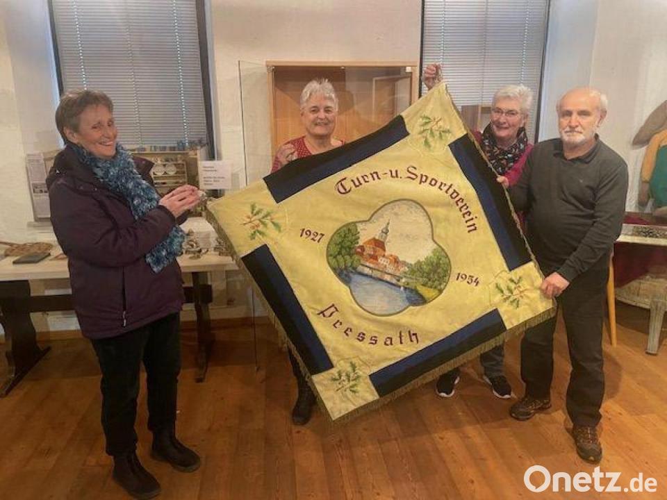 Prunkstück ist sicherlich die Vereinsfahne des TSV Pressath, die jetzt einen Ehrenplatz im Heimatmuseum gefunden hat. Die Fahne des 1927 gegründeten Traditionsvereins war 1954 angeschafft worden. Nachdem die Fahne über sechs Jahrzehnte ihren Dienst bei zahllosen Anlässen getan hatte und die aufwendigen Stickereien der Fahne begannen sich zu zersetzen, entschloss man sich, zum 90-jährigen Bestehen des TSV im Jahre 2017 eine neue Fahne anzuschaffen. Die Restaurierung wäre zu umfangreich und kostspielig geworden. In einer Vorstandssitzung wurde der einstimmige Beschluss gefasst, die „alte“, aufwändig gestaltete Fahne zur Erhaltung dem Heimatmuseum zur Verfügung zu stellen. Wunibald Heinl als Vorsitzender des Bauausschusses brachte die Fahne mit seiner Frau Kornelia nach eingehender Reinigung mit allen dazugehörigen Utensilien ins Heimatmuseum.