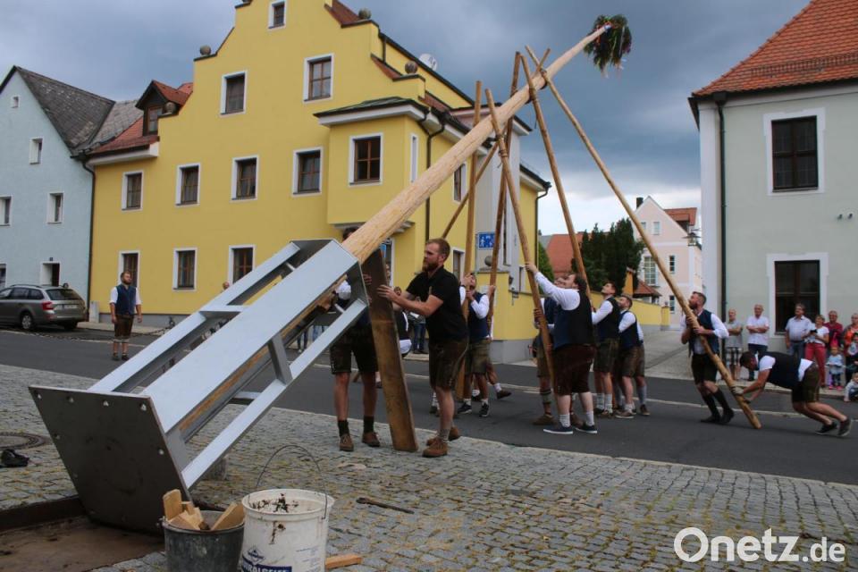 Trotz der aufziehenden Wolken machten sich die Burschen daran, den Kirwabaum vor der Kirche St. Georg aufzustellen. Das 20 Meter lange Prachtstück wollte nur mit Schwalben und Muskelkraft gestemmt werden. Aber Josef Keilwerth und seine Burschen sind keine Anfänger und nach zahlreichen Maibaum- und Kirwafesten stand der Baum in wenigen Minuten.