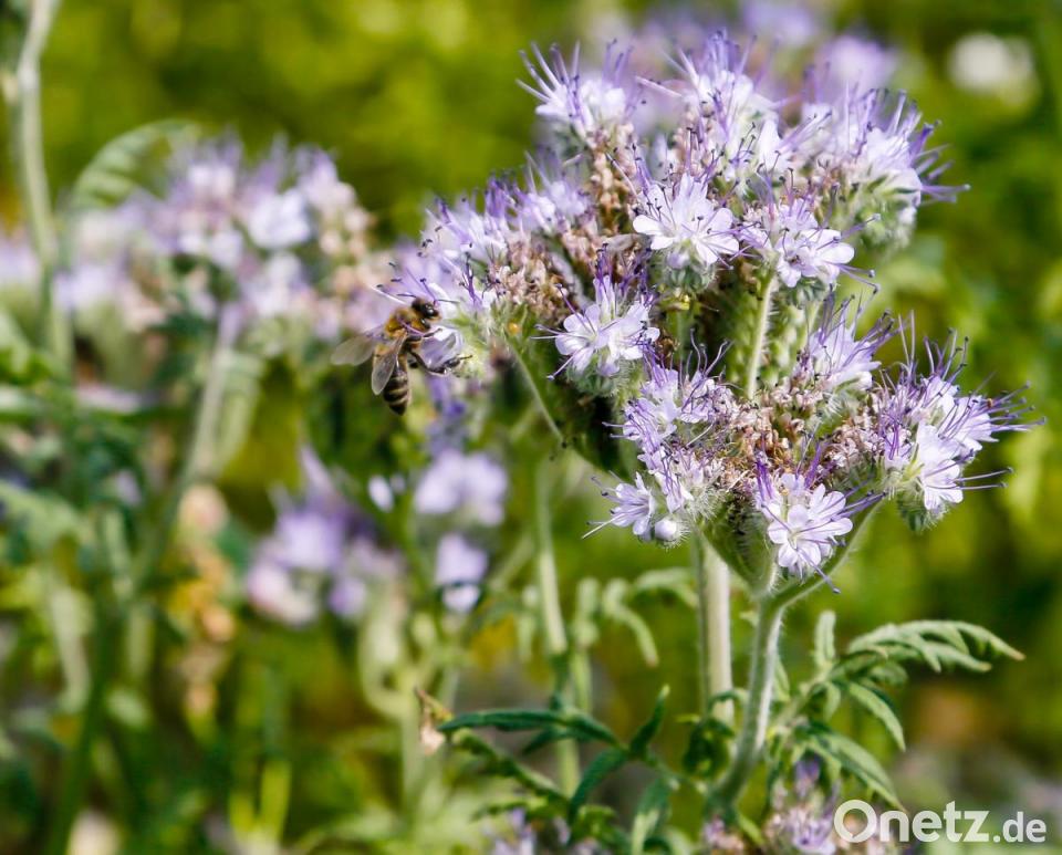 Ende März hat Beer die Äcker zum ersten mal gegrubbert, um den Boden vorzubereiten. Da hat er in Ettmannsdorf schon Taubnesseln stehen lassen, die in einem Ackerstreifen blühten. Ende April ging's ans säen. Die spezielle Saatgut-Mischung enthält Borretsch, Ringelblume, Koriander, Buchweizen, Fenchel, Sonnenblume, Öllein, Esparsette, Büschelschön (Facelia), Ölrettich, Schweden-, Inkarnat- und Perserklee, Sommerwicke, Schafgarbe, Kornblume und Klatschmohn. Momentan prägt bei Pretzabruck Facelia das Bild. "Da muss man reingehen, damit man merkt, wie's brummt", sagt Beer. Das stimmt. Hummeln, (Wild-)Bienen, Schmetterlinge, allerlei Fliegen sind auf den Blüten unterwegs. Beer hat auch noch vier weitere Kleesorten eingesät, die auch das Ziel der Flächen erfüllen sollen: Möglichst durchgehend bis zum Herbst soll irgendwas blühen. Ansonsten sieht's nämlich damit in der Flur relativ schlecht aus, wenn die Rapsblüte vorbei ist.