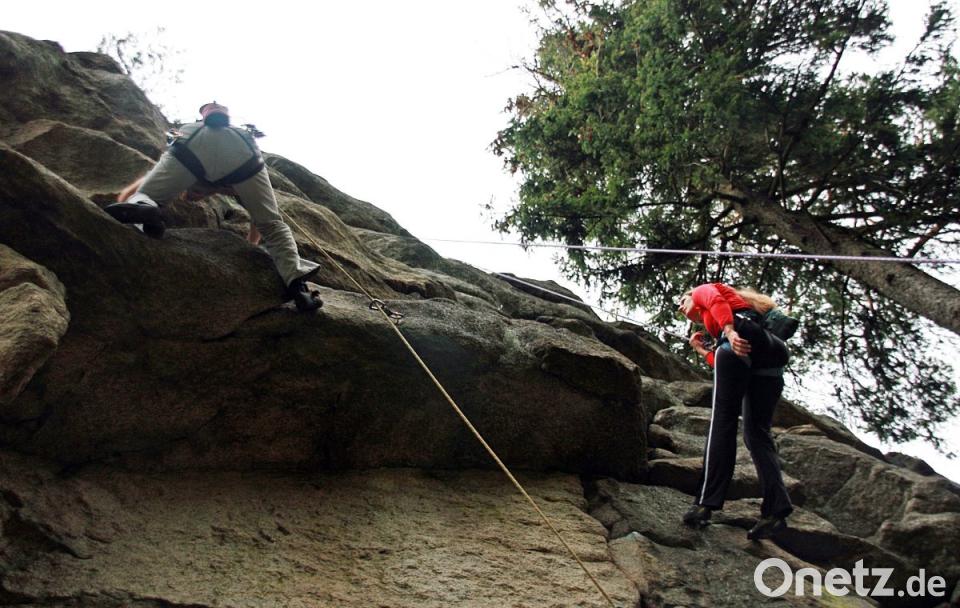 (lst) Der Weg ist das Ziel - wohl kaum ein Sport spendet so großzügig Metaphern wie das Klettern. Aufstieg, Absturz, Fallen, gehalten werden. Hört sich an wie im richtigen Leben, oder? Und: Die Angst ist immer dabei. Aber das ist ja genau der Punkt. Die Finger schmerzen, die Muskeln sind zum Zerreißen angespannt. "Jetzt mal ganz tief durchatmen", ruft mir von unten der Püchersreuther Heribert Flieger, Fachübungsleiter Alpin Klettern des Deutschen Alpenvereins (DAV), Sektion Weiden, zu. Leichter gesagt als getan. Ich hänge in 20 Metern Höhe am Räuberfelsen im Steinwald. Noch sieben Meter bis zum Ziel, sieben schier unüberwindliche Meter bis zum Gipfel.