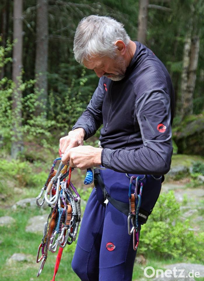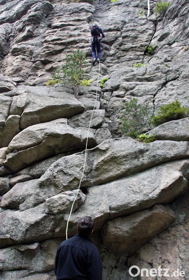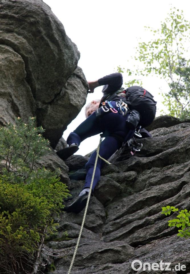 Leicht waren auch die ersten Meter meines Aufstiegs im Räuberfelsen. Als Kletter-Einsteiger darf ich mir den Fichtenweg vornehmen. Eine Route mit Schwierigkeitsgrad 3+. Für einen Anfänger nicht ohne. Aber zu schaffen, versichert mir Heribert Flieger. Ich vertraue ihm. Denn wer seit über 50 Jahren in den Bergen unterwegs und zudem Fachübungsleiter ist, muss wissen, wovon er spricht, was er mit zutrauen kann. Im Steinwald gibt es Touren bis zu 9+, auf der elfstufigen Skala also schon ganz weit oben angesiedelt.