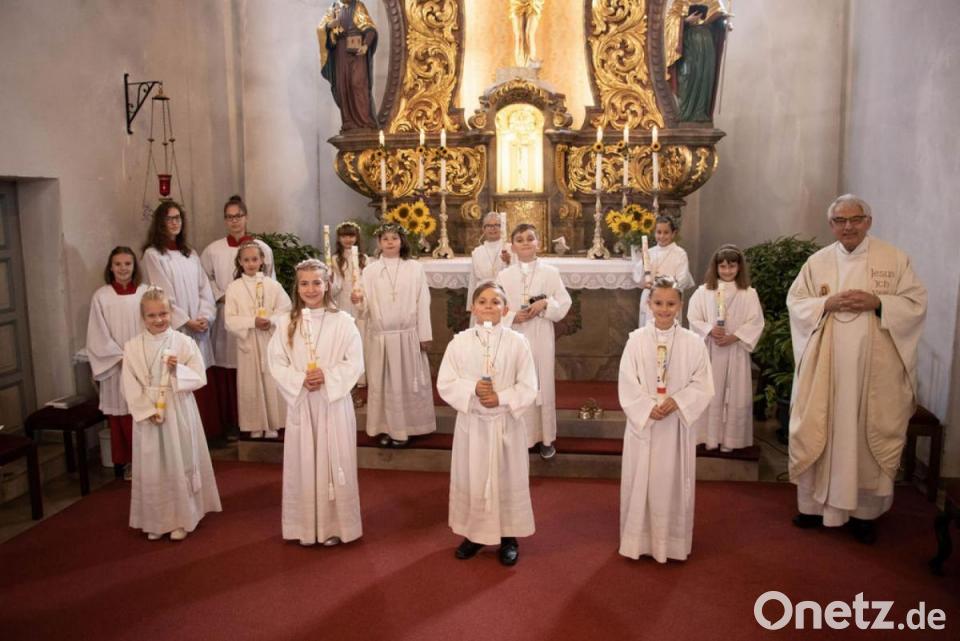 Elf Kommunionkinder feierten in der Peter-und Paul-Kirche in Püchersreuth Erstkommunion. Die neun Mädchen und zwei Buben warteten vor dem Eingang und zogen dann zusammen mit Pfarrer Manfred Wundlechner feierlich in die Kirche ein.